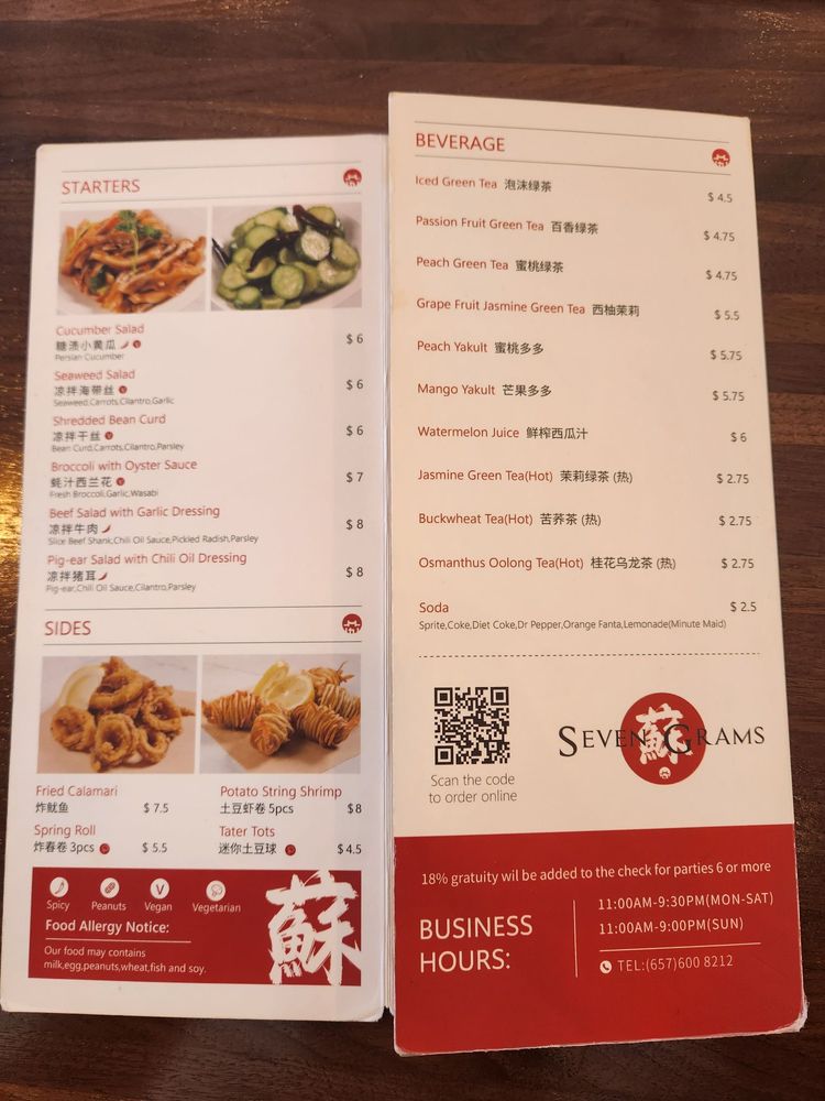 Introducing the menu at Seven Grams, a Chinese restaurant in Tustin, CA, offers a variety of dishes that cater to different tastes. From the signature Seven Grams XLB to the flavorful Scallion Pancake and Golden Prime Beef Noodle Soup, each dish brings authentic flavors and textures. Customers have praised the Pig Ear Salad, Xiao Long Bao, and Wontons in Chili Oil for their unique and delicious tastes. The restaurant also offers vegan and vegetarian options, catering to a diverse range of diners. With a modern decor and attentive service, Seven Grams provides a satisfying dining experience. Whether you're looking for a quick lunch or a relaxed dinner, Seven Grams is a must-visit spot for Chinese cuisine lovers.